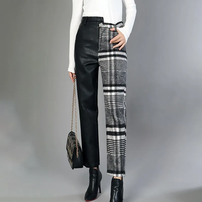 Special Offer TWOTWINSTYLE spodnie ze skóry sztucznej dla kobiet wysokiej talii Hit kolory asymetryczne Patchwork do kostek wełniane spodnie kobiet 2019 wiosna nowy Discount 60% Today!