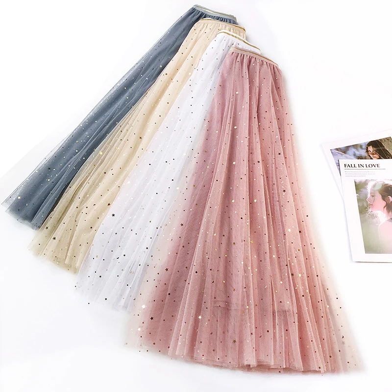 Special Offer 2019 nowa wiosna tiulowe spódnice moda damska świecąca gwiazda spódniczka baletowa długie plisowane spódnice spódnica trzy czwarte Saias Faldas Jupe Femme Discount 26% Today!